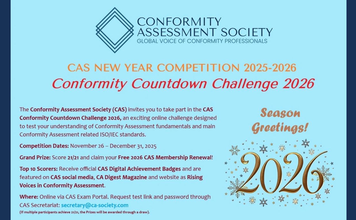 The Conformity Assessment Society (CAS) invites all members worldwide to take part in the CAS Conformity Countdown Challenge 2026, an exciting online challenge designed to test your understanding of Conformity Assessment fundamentals and main Conformity Assessment related ISO/IEC standards.
